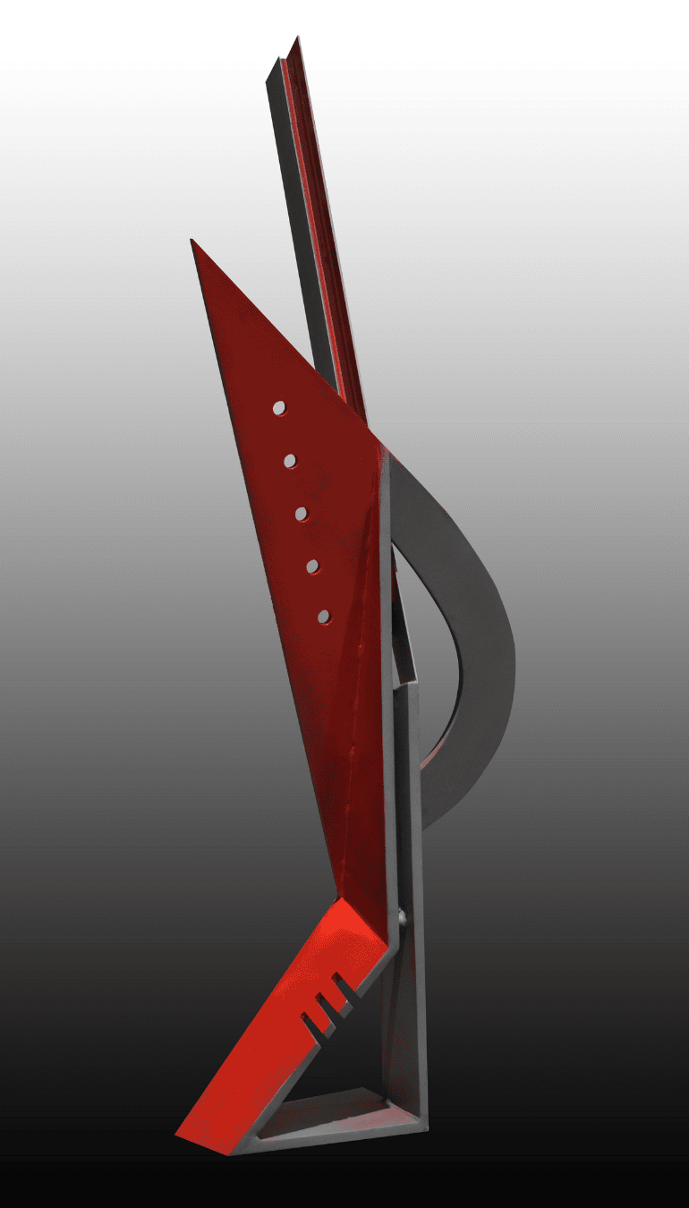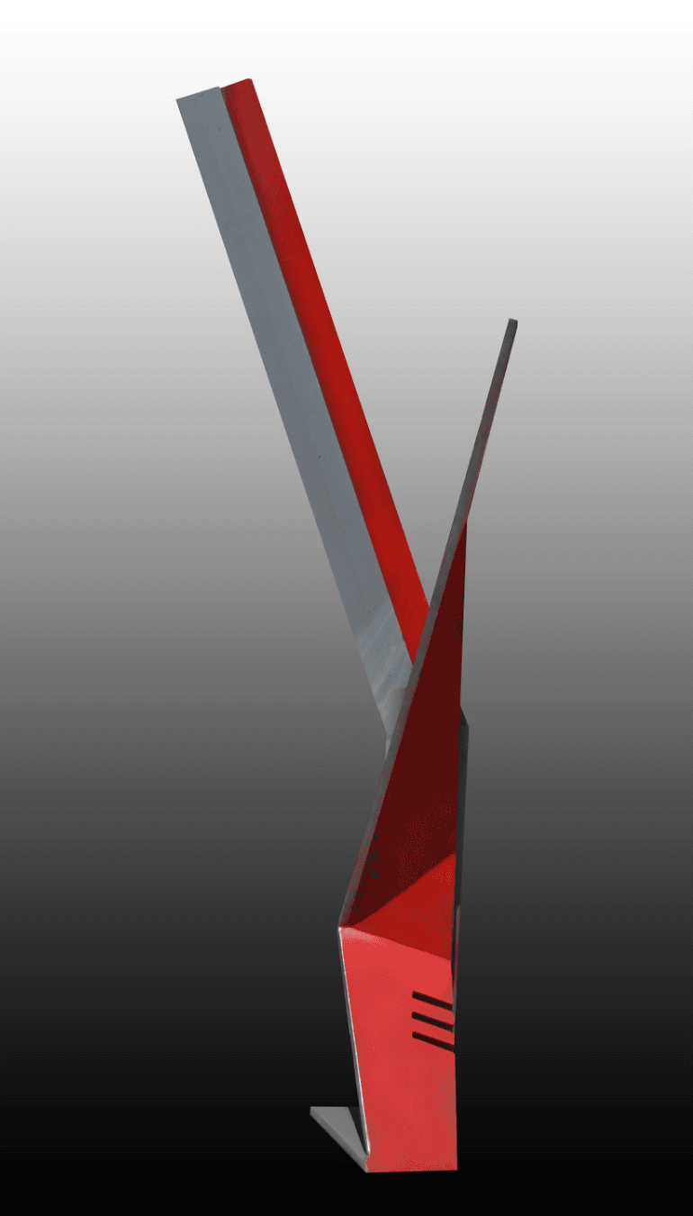 La composición se organiza a través de ángulos agudos y una curva que interrumpe la verticalidad, sugiriendo una tensión mecánica y una elegancia agresiva. Es una pieza de gran fuerza expresiva, ideal para coleccionistas que buscan arte contemporáneo con una presencia audaz y un carácter innegable.