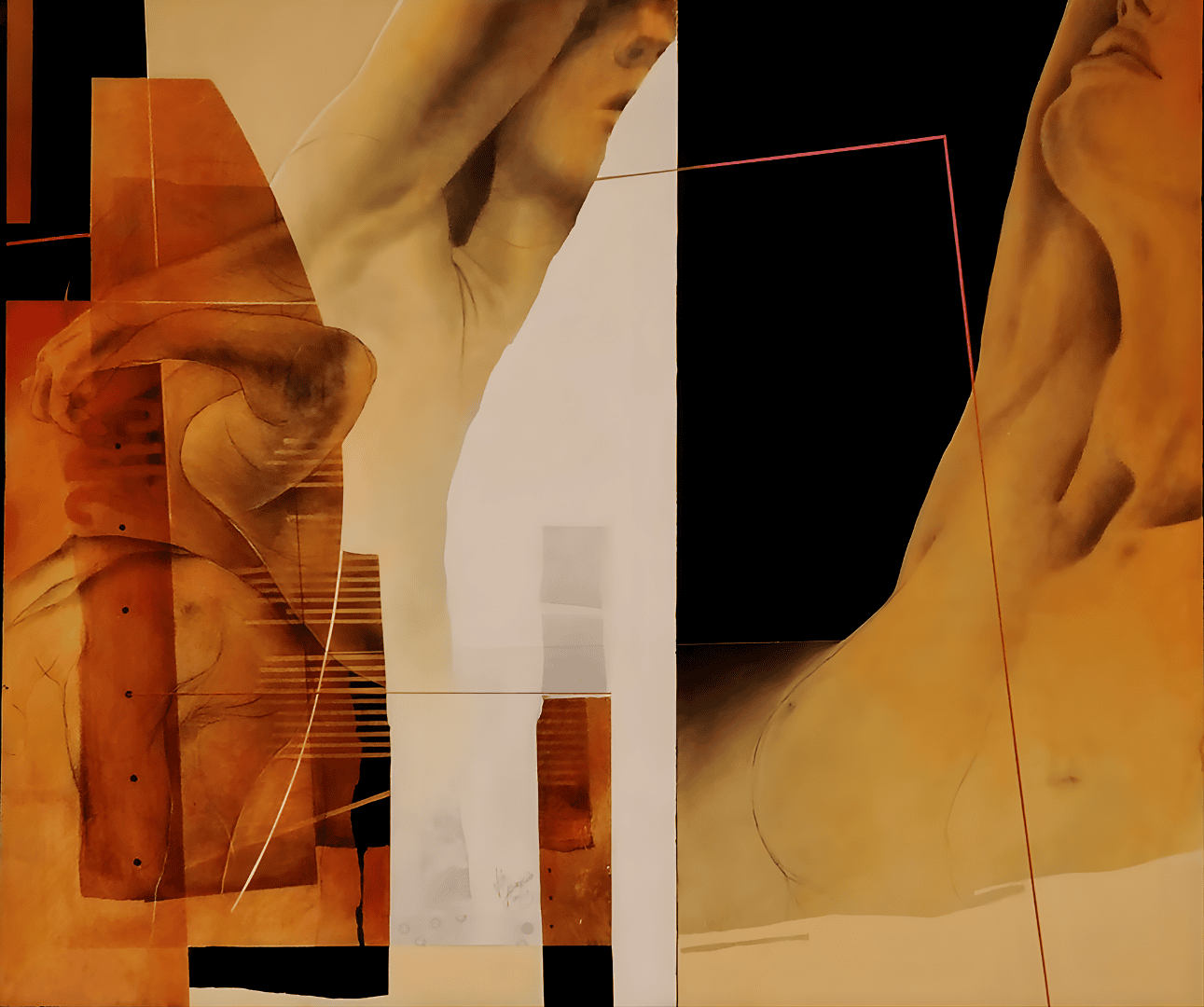 La obra destaca por su paleta orgánica de tonos piel, ámbar y ocre, que contrastan dramáticamente con bloques de negro absoluto. A diferencia de sus trabajos más industriales, aquí las líneas finas y los trazos geométricos actúan como «anclas» que contienen la suavidad de las formas físicas, creando una atmósfera de intimidad, introspección y, como indica su título, una delicadeza técnica insuperable.