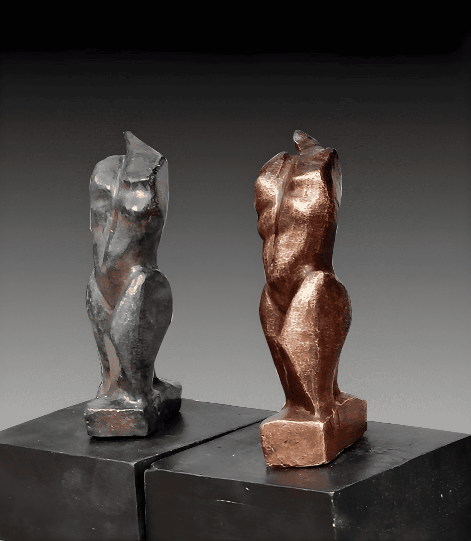 Esta pareja de esculturas en bronce fundido representa una interpretación magistral del torso humano. Con un lenguaje visual que oscila entre lo orgánico y lo arquitectónico, cada pieza presenta un juego de planos y aristas que capturan la luz de manera única, revelando la fuerza y la vulnerabilidad de la figura.