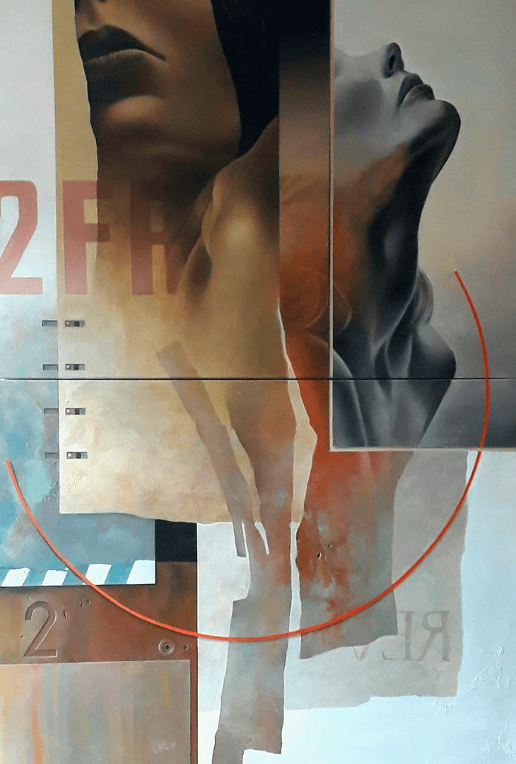 La composición se divide en secciones que alternan entre el realismo fotográfico de perfiles femeninos en claroscuro y fondos de textura matérica que sugieren superficies metálicas recuperadas. La presencia de tipografía industrial y códigos fragmentados añade una capa de modernidad urbana, mientras que un arco carmesí perfecto atraviesa el lienzo, proporcionando un equilibrio geométrico que unifica toda la experiencia estética.