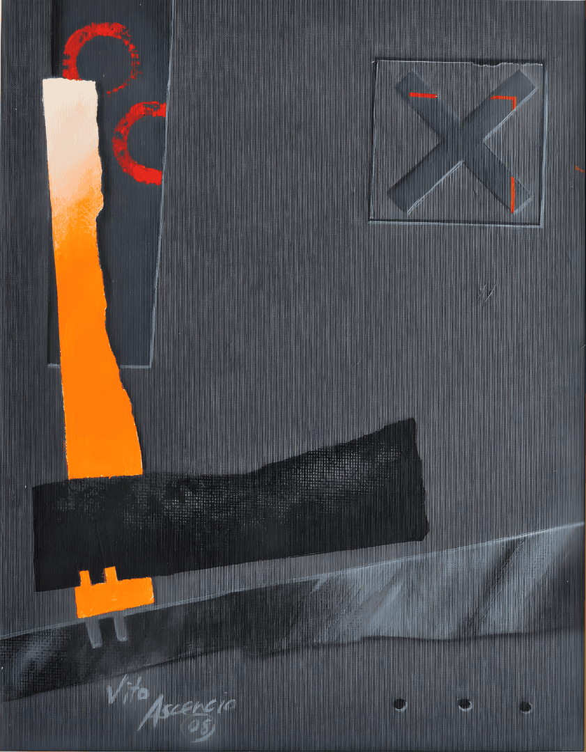 «Un Cuadro X» representa una etapa de madurez técnica excepcional en la trayectoria de Vito Ascencio. En esta obra de 2005, el artista abandona la rigidez del plano liso para adentrarse en una exploración matérica profunda, donde el lienzo adquiere una cualidad casi escultórica gracias a un fondo estriado de un gris carbón intenso.